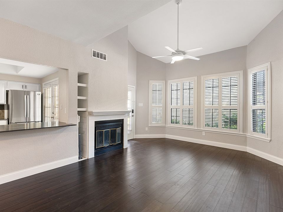 Wood-burning fireplaceOpen floorplanUpdated bathroomSleek dark bamboo floorsNew quartz counter topCovered patioVaulted ceiling