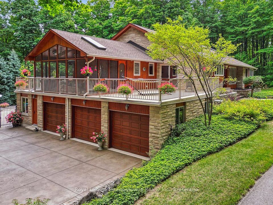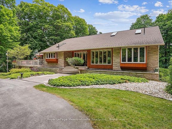 Discover an unparalleled gem rarely available on the market: a private and serene estate with a custom-designed home that fulfills every dream. Set on over 10 lush acres amidst the stunning Niagara Escarpment, this meticulously cared-for property is just minutes from the 401 and downtown Milton. Surrounded by vibrant perennial gardens and towering mature trees, this home is perfectly positioned in the heart of Halton Conservation's premier parks. You'll be just moments from Kelso Conservation Area, Rattlesnake Point, Crawford Lake, Hilton Falls, and the Bruce Trail ideal for outdoor enthusiasts and nature lovers. The custom-built bungalow features over 6,000 sq. ft. of exquisite living space. Its open-concept design showcases vaulted ceilings, a double-sided stone fireplace, a spacious kitchen with pine cabinets, granite countertops, and an island. A convenient wet bar, elegant dining room, and a fantastic outdoor screen room offers the perfect space for 3-season entertaining. Enjoy stunning views from walkout decks off the kitchen, screen room, sun room, and master bedroom balcony. The lower level is a haven of relaxation and recreation. You will find a large recreation room with a cozy wood-burning stove, a games room, four additional bedrooms, and access to a three-car garage. Walk out to a luxurious inground pool with a hot tub, cabana, and a soothing water feature. The home is equipped with a 400-amp electrical service, a propane-powered generator, and a geothermal heating and cooling system. A separate two-car garage provides the ideal "Man Cave" and additional storage for garden equipment. Garden enthusiasts will love the large greenhouse/potting shed, and the property boasts a fire pit with a patio area, night landscape lighting, and over one kilometer of meticulously groomed walking trails. Why settle for a cottage when you can have this dream home without the drive? Experience the ultimate in luxury and tranquility this is truly what dreams are made of!