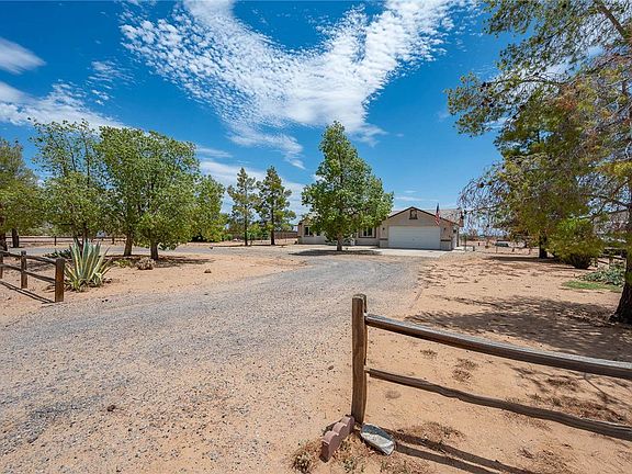 Acreage, Freedom & Views Your Golden Valley Escape Awaits! Welcome to 5592 W Tonto Road a rare 1-acre gem in Rancho Verde Estates with panoramic mountain views and no HOA restrictions. This 2-bedroom, 2-bathroom home has been freshly updated with a brand-new roof, plush new carpeting, and modern conveniences throughout. Enjoy vaulted ceilings, walk-in closets, and a sunlit open living space perfect for everyday comfort or weekend entertaining. The kitchen offers casual dining space, and the home comes fully furnished for an effortless move-in. Outside, your private 1.03-acre lot is framed by mature trees including striking Canary Island Palms plus a fenced perimeter, RV hookups, and room to build the garage or shop of your dreams. The 2-car garage is finished, insulated, and cooled ideal for your toys, projects, or storage. No HOA. No nonsense. Just the freedom to live, work, or play exactly how you want.