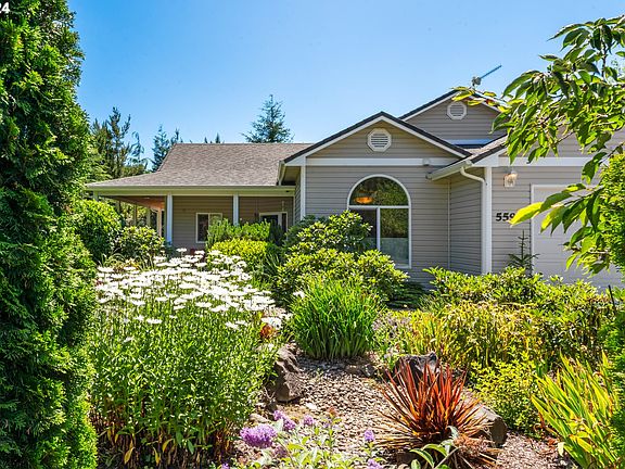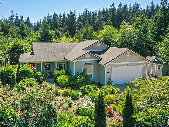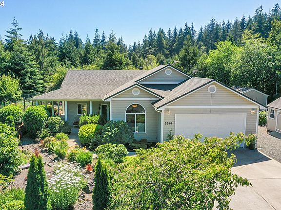 Coastal living at its finest. This 3-bedroom 2-bath home is located within walking distance from Woahink lake recreation area and only minutes from town. Enjoy the peace and serenity that surrounds you in this unique place. This home boasts an open floor plan, seamlessly connecting the living, dining, and kitchen areas. The kitchen features quartz countertops, stainless steel appliances, and peninsula counter with convenient bar seating, perfect for casual meals or socializing with guests. Off the living room is a warm, sun room that can be utilized as an office space, music room, or craft room with access to the outside deck. The mature landscaping hides a green house for your gardening efforts, a studio/shop, private hot tub, and garden shed. This is a true garden oasis with permanent green space to the South and West that enhances your personal privacy. Don't miss your chance to call this unique property your home.