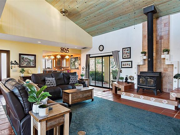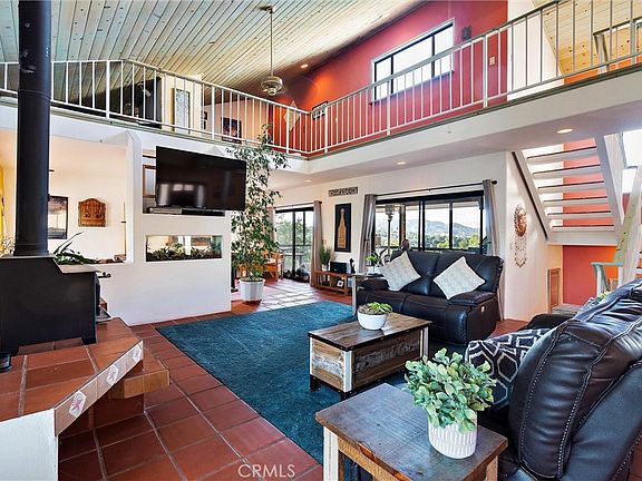 The split-level home features a private suite with fireplace, reading nook, and access to the deck with Lake views. The primary bath has dual vanities and a step-down, walk-in shower. The living room is spacious with a vaulted ceiling, wood stove, wet bar, and pool table area. A loft overlooks the room and has been used as an overflow bedroom. Upstairs is a bedroom adjacent to the second bathroom with a deep, tiled tub. On the lower level there are two more bedrooms: one is quite large with two beds and the other has a single bed and a bunkbed.