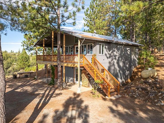 Private location at the very end of a cul de sac in the pines with gorgeous panoramic views for miles! Just minutes away from downtown Murphys. This two story home on over an acre has plenty of room for your RV, boat, toys etc.. Step inside the upper level from the newer cedar deck to an open concept living room/kitchen that has a warm, cozy cabin like feel boasting hardwood floors, exposed beams & knotty pine ceilings, a fireplace and lots of windows to take in those mountain views. There are two nice sized bedrooms. One with it's own sliders to a separate deck and a full guest bath on this level. Downstairs you will find an updated and private master bedroom with it's own romantic, antique wood stove & french doors, which open to a covered patio. There is also a sizeable bathroom with single vanity, shower stall & storage closet along with a separate laundry room. Outdoors you will find a nicely sized work shed, a custom built chicken coop, a fenced in large extra/storage etc... room and a building pad at the end of the dirt driveway in the case you may want to build a garage or place a carport. This mountain retreat would make an exceptional primary home, vacation getaway or investment property. No HOA's out here! And property is in an Firewise community, come take a look. This could be exactly what you're dreaming of and so close to many lakes, ski resorts and various tourist attractions too!