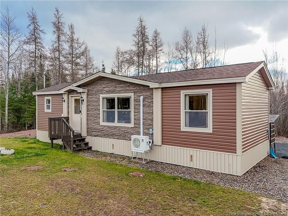 Welcome to 56 Clara Street, a modern and well-designed home set on over an acre of land on a quiet street within a family-friendly subdivision. Centrally located between Oromocto and Fredericton, this property offers the perfect balance of privacy and convenience. Just three years young, the home is ideal for minimalists, downsizers, or those looking for a smart step up from condo living without the cost or upkeep of a larger home. The modern layout features two bedrooms positioned on opposite sides of the home for added privacy, a full bathroom, and beautiful laminate flooring throughout. The bright kitchen is anchored by a large island that comfortably serves as both a dining table and gathering space, creating a warm and functional heart of the home. Comfort is enhanced with an efficient ductless mini-split, providing heating and cooling year-round. Outside, enjoy summer days in the above-ground pool while still having plenty of space to relax, garden, or play thanks to the generous lot size. A rare opportunity to enjoy modern living, outdoor space, and a central location in a quiet, established setting.
