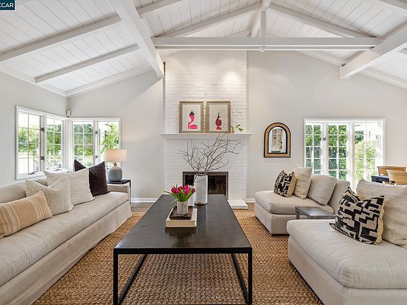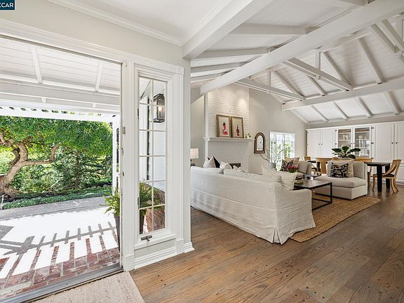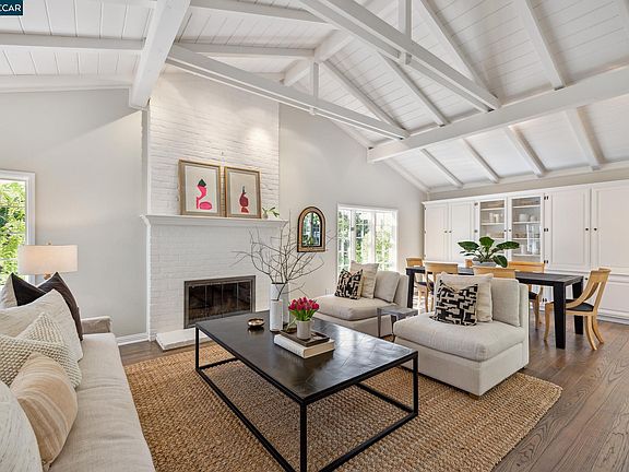 Set on .61 private ac. near downtown Orinda, this one level home w modern amenities offers finest interior/exterior details & design.This home features vaulted ceilings, hardwood floors, beautiful windows, 3 fireplaces, custom recessed lighting, custom moldings, ideal for indoor/outdoor living & entertaining! Open floor plan combines spacious formal living & dining rooms which features beautiful hardwood floors, vaulted wood beamed ceilings, fireplace w custom mantle, dual paned windows & custom built ins; wonderful space for entertaining/peaceful respite. Heart of home is light-filled kitchen/family room. Updated eat in kitchen w vaulted ceilings boasts white cabinets, quartz countertops, six-burner cooktop,Wolf double ovens, large peninsula, Sub Zero fridge. Family room w fireplace, built ins-cozy place to relax/entertain. Bedroom wing offers private primary suite w fireplace, walk-in closet, access to private patio, updated bathroom. The 3 additional light-filled bedrooms all offer privacy & generous closets & served by 2 updated bathrooms. Fabulous landscaped gardens w large flagstone patio & upper patio w adorable playhouse offers space to play, entertain, relax. Property includes land beyond-orchard, redwoods, explore! WALK TO TOWN, BART, COMMUTE ROUTES. TOP RATED SCHOOLS