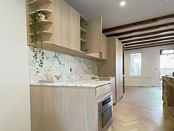 Parlor Floor: The heart of the home, this level presents a gracious, open-concept layout centered around a stunning chef's kitchen equipped with Sub-Zero and Wolf appliances. Floor-to-ceiling glass doors open onto a private deck, creating a seamless flow for indoor-outdoor living and providing direct access to the garden below.