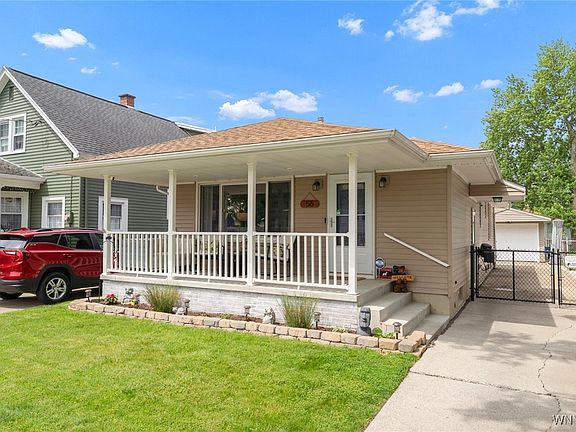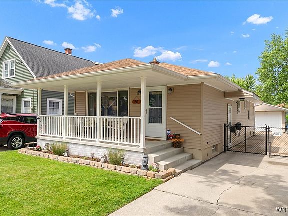 Welcome to 56 Hansen Avenue! This adorable, single-story South Buffalo stunner is ready for its new owner. Located behind Notre Dame Academy’s Abbott Campus, this 3-bed, 1-bath ranch-style home blends charm, smart updates, and effortless living. The cozy, covered front porch is fully wrapped in maintenance-free vinyl, from the rails and columns to the ceiling. New concrete floor and recessed lighting make this a great space to relax, entertain, or just soak in the neighborhood. Inside is a bright, open kitchen with a spacious vaulted ceiling, recessed lighting, solid wood cabinetry with crown, vinyl flooring, and a movable island offering bonus counter/cabinet space and flexibility. The eat-in kitchen includes SS appliances: a five-burner range, over-the-range microwave, and dishwasher. The kitchen opens to an inviting living room with gleaming original hardwood floors, massive picture window with loads of natural light, elegant entry door, and a Google Nest smart thermostat. Off a small hallway from the kitchen are three good-sized bedrooms, each with hardwood floors, fresh updated trim, and replacement doors throughout. The bathroom is thoughtfully upgraded with a modern vanity, updated lighting, wainscoting, and a tiled tub surround. The side hallway has a unique Dutch door that opens to the side entry and also gives access to the home’s hidden gem: a fully finished basement bringing serious extra space along with luxury vinyl plank flooring, recessed lighting, glass block, and a custom dry bar that stays with the home. There’s also a utility/ laundry area, with tons of dry storage. The entire home is wrapped in vinyl siding, has central air conditioning, and a backyard dream—private, fully-fenced/gated, and plenty of lawn & green space behind the garage with a tool shed. There’s a newly built deck under a negotiable hot tub and a 1.5-car garage with power opener and its own electrical sub panel. Other updates include a widened concrete driveway with extra paved area, expanded rear concrete pad/patio, sump pump, and fully upgraded electrical service. Open houses Saturday 6/21 and Sunday 6/22 from 1pm-3pm. Offers will be reviewed Wednesday, 6/25 at 2pm.
