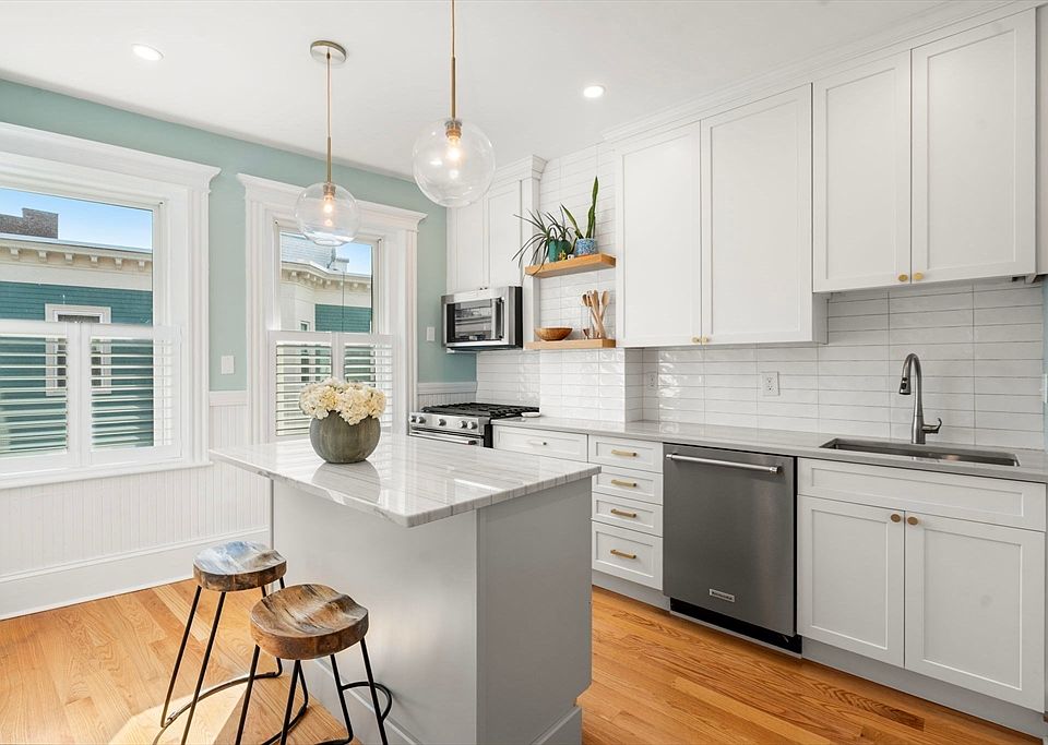 This renovated penthouse, located in a brick building on one of Charlestown’s most sought- after locations, combines high-end amenities w/ historic charm & boasts a state-of-the-art kitchen & views of the Bunker Hill Monument & city skyline. Soaring ceilings & abundant natural light make this home stand out from the rest. Designer kitchen renovation spared no expense w/ freestanding quartzite island, 42 inch shaker cabinetry w/brass hardware, 2x12 custom white subway tile surround, ss. appliances & a view of the Bunker Hill Monument. The inviting living and dining space boast hardwood floors, a built in hutch and a wall of windows allowing for ample natural light. Sun filled master is spacious w/ hardwoods. Renovated full bath has marble vanity & custom tile surround & built in shelving. Stunning shared roof deck is 1 flight up w/ views of city skyline Bunker Hill Monument. This is the one!