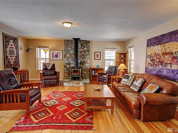 Sun kissed Twisp Farmhouse on 3+ acres embraces mountain top views & fields below. 1999 Build. Covered wrap around porch of this 2,082 s.f. home. 2 bed. 2.5 Bath. Real wood floors throughout. Woodstove is F.S. warms you perfectly.Farmhouse kitchen. Open floor plan great for entertaining.Master bedroom enjoys private wood deck with ensuite bath.Large Guest bedroom & Bath. Lots of storage.Detached 1,224 sf Garage/shop with Carport.Great storage.Garden house, tool shed, fenced garden, chicken coop.