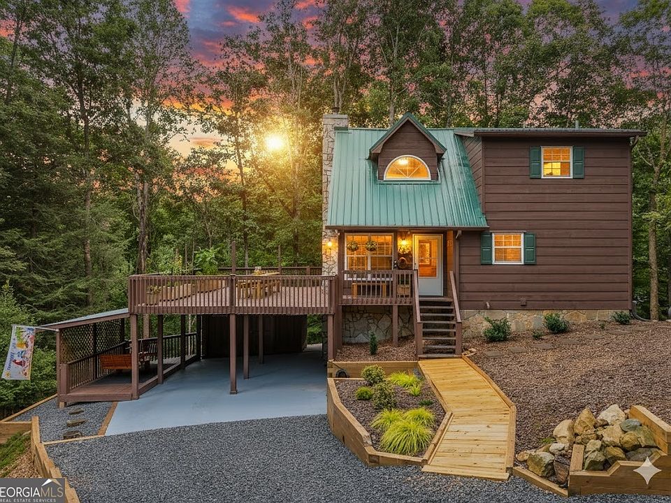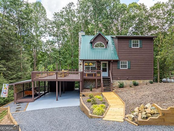 Come home to this impeccably maintained 3 BR/3 BA mountain cabin in the desirable Buckhorn community. Thoughtfully designed with a bed & bath on each level, this home combines charm, comfort & modern upgrades in a peaceful setting with seasonal mountain views. The exterior welcomes you with a large circular driveway & 2-vehicle carport, while multiple outdoor living spaces invite you to enjoy the mountain lifestyle. From the screened-in porch to the front deck that is perfect for BBQs, to the covered sitting area w/swing & firepit spot for gathering amongst the fireflies, this home shines in every season. Step inside the open great room that is light & bright w/soaring tongue&groove vaulted ceilings, floor-to-ceiling stone fireplace, architecturally beautiful feature windows & dining area. The well-appointed kitchen features white shaker cabinetry, tile backsplash, leathered granite countertops & upgraded Samsung Bespoke appliances w/customizable finishes. The main level also offers a full bath w/modern updates & ample-sized guest bedroom w/French doors to the rear porch. Upstairs, the private master suite has wood-finished vaulted ceilings, French doors to its own private porch, roomy ensuite w/double vanity & spacious walk-in closet. The finished terrace level expands the living space w/a generous den that is perfect for movie nights or game days, along with a huge bedroom w/ensuite bath, laundry/mechanical room & spacious workshop/storage area w/access to the exterior. A full-home generator, new steps leading to the firepit, French drains, all-new retaining walls & 3-year-old HVAC system provide peace of mind. Sold completely furnished, this home is truly move-in ready. Tucked within a serene community that does not allow STRs, residents enjoy access to a riverside park, community pond & public golf course. With all-paved access & central location between Ellijay & Blue Ridge, this property offers the perfect balance of privacy, convenience & outdoor adventure.