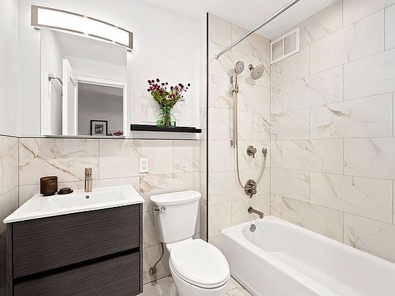 The bathroom is beautifully finished with Carrara marble tile and contemporary fixtures, offering a refined, spa-like retreat. The apartment’s converted alcove layout provides flexibility for a dining area, office nook, or expanded living space.