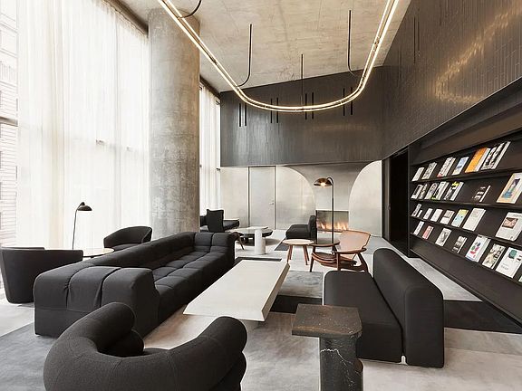 The corner primary suite is a serene sanctuary, complete with direct terrace access, an oversized walk-in closet, and a spa-caliber bath wrapped in travertine and marble, radiant heated floors, a deep soaking tub, and oversized windowed glass walls showcasing southern views. Every inch of the residence has been thoughtfully considered, from Appalachian White Oak floors and custom lighting to motorized shades and expertly built-out closets.