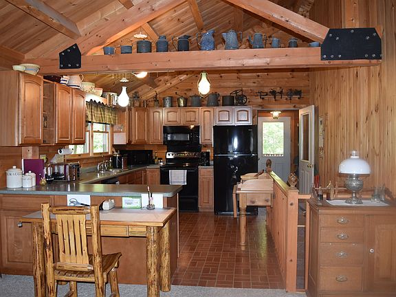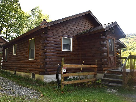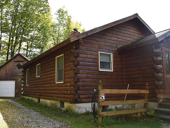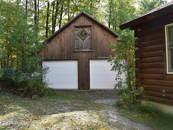 Welcome to this charming log home, where warmth and character abound! Nestled on 17.5 acres of quiet countryside, this unique retreat features a beautiful wood interior, highlighted by exposed beams and antique decorative lighting. The inviting first floor offers an open living area perfect for gatherings, along with two cozy bedrooms and a full bath. Enjoy the comfort of a woodstove, adding a rustic touch and warmth to your living space. A convenient mudroom/entry makes coming and going a breeze. Head downstairs to discover a spacious family room, ideal for relaxation and entertainment, along with two additional bedrooms and another full bath—perfect for guests or family. Step outside onto your private covered porch, where you can savor calming views of the hidden 2-acre meadow and surrounding mountains. A year-round brook runs through the property, enhancing the serene atmosphere. Additionally, the oversized two-car detached garage offers ample storage above, providing plenty of space for all your hobbies and equipment. Embrace the tranquility and beauty of country living in this lovely log home—your peaceful retreat awaits!