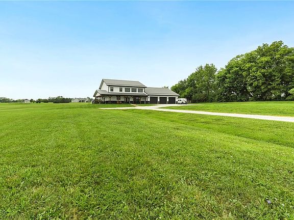Big Beautiful Almost new Barndominium 5bedroom home in a rural setting, but only .3 mile south of 50 hwy access. Home on 3+ acre lot, Circle driveway to the Huge 3-door garage with 2 tandem bays, 1 bay has drive through door and garage has a full bathroom, 8'x8' concrete Storm shelter/storage area and a 2nd washer/dryer hookup. Brand new stacked stone outdoor kitchen to assist with entertaining on the stamped concrete wrap around patio/porch. Double front door entry to 18' cathedral ceiling living room with fireplace and great natural lighting. Large kitchen with 8x5 island, custom cabinets, stainless appliances and step in pantry. Huge eat-in dining area with atrium doors to access the outdoor kitchen. 2 rooms on main floor that can be 4th and 5th bedrooms, but are currently utilized as a playroom and office. Main floor also has a full bathroom and a large mudroom. Upstairs has Primary master suite with walk in closet and room for sitting area. Upstairs has bedroom 2 & 3 with large closets and they share a full bath. Upstairs laundry is central to main bedrooms. Lots of beautiful touches and upgrades to this custom home... Energy efficient, has water softener, 2x6 framing with R24 insulation, R10 floor insulation, R44 ceiling insulation, and more. This gorgeous home has Centerview address, Warrensburg schools.