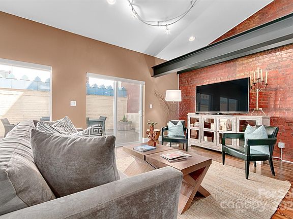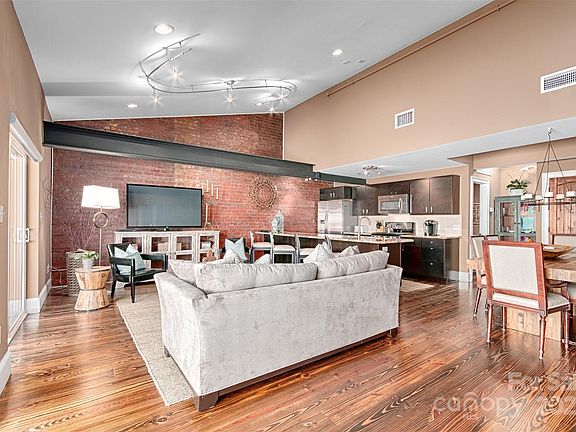 Soaring ceilings, exposed brick walls, and bold steel beams frame an open living space that feels both dramatic and inviting. With two spacious bedrooms and two-and-a-half baths, the residence offers refined comfort, while its architecture tells a story of Asheville’s vibrant past.