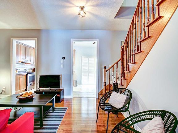 Gorgeous Freehold ~1336 Sq Ft, 3 Bedroom & 3 Bath Townhome With No Neighbours Behind! House Shows 10+++. Main Level W/9Ft Ceiling, Rich Hardwood Flrs & Hardwood Staircase. Large Great Rm For Family Gatherings. Bright Eat-In Kitchen W/Tall Cabinetry, Backsplash, Window & S/S Appliances. Walkout From Breakfast Area To A Large Deck In Fenced Backyard. Upper Hallway W/Hardwood Flrs. Master Suite W/4Pc Ensuite & Huge Walk-In Closet. Other 2 Bedrooms Of Good Size.