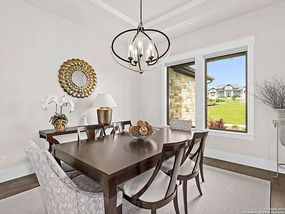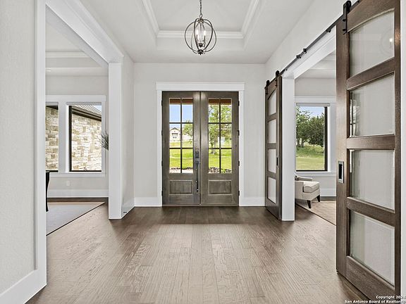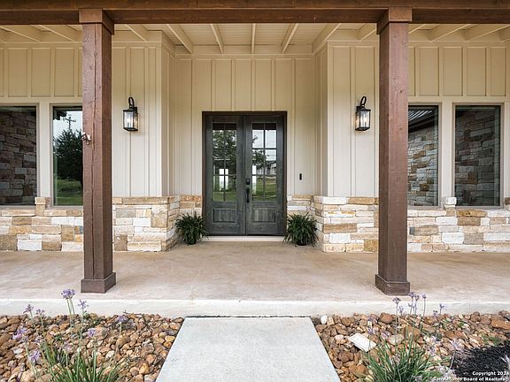 Motivated Seller! Sabinas Creek Ranch MASTERPIECE! Country living only 6 miles from Boerne. One-story picturesque Texas Hill Country Living ,Gated Community with Acreage lots and Boerne Schools. Game room with coffered ceiling and big windows to view the hills could be a fourth bedroom. Here are the many extras described. Metal Roof, Well landscaped yard area including sod and plants front and back with irrigation system; back yard cleared and sodded for play area, pool, etc., Outside shed/Workshop which matches the house- electrical included, House prepped and pre-wired for full house generator, Installed security system through BSG -two exterior cameras, two motion lights, alarm system connected to police, fire and BSG. Smoke detectors connected to fire department, Insulated and heated well house and approximate 2,700 gallon storage tank, 3-car garage with one storage bay; fully epoxied with high end epoxy, Water softener in garage (Kinectico), Window and door trim added inside -craftsman style, Spray foam above, ie below roof, hybrid insulation in walls, All wood floors throughout, except for tile in baths and laundry, Built-in cabinets and shelving in study; coffered ceiling: upgraded, high end barn doors, Cambria Quartz countertops kitchen and powder; quartz in laundry and master bath; granite in two guest room baths, Frameless glass shower doors, Upgraded faucet fixtures and commodes, Laundry room with sink, Crown molding in guest rooms, Two gas log fireplaces - one in living room and one on back patio. Ceiling fans throughout, High end kitchen aid appliances including built in refrigerator; double oven, microwave drawer; 5-burner gas stove, Upgraded kitchen cabinets with upper glass and electric puck lights, Reverse Osmosis water system with dispenser in kitchen, Soft close drawers and cabinets throughout, dimmer switches in multiple locations, Canned lights added in Great room, Game room and primary bedroom. Solid core doors throughout; door levers upgrade, Hunter Douglas custom shades throughout and in garage. Vast majority have rechargeable battery system that are automated. A Beautiful Home to View and a Joy to Show.