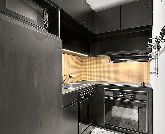 The separate kitchen offers abundant cabinet space, modern appliances, and a smart, functional layout—perfect for cooking and entertaining. The pristine white bathroom is beautifully maintained with a large mirrored wall and a clean, contemporary design. The corner bedroom enjoys two exposures, filling the room with bright morning light, and includes a spacious closet for ample storage.