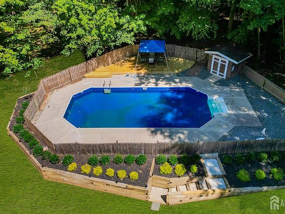 Set on 2.33 acres, this upscale contemporary home offers a private, self-contained getaway where the charm of a retreat meets the comfort of a luxury escape. A fenced inground pool with a brand-new liner, an expansive patio, and a new deck set the stage for outdoor enjoyment. A long driveway leads to a magnificent 4-bedroom, 2.5-bath residence where classic elegance blends effortlessly with modern design. Inside, a dramatic 2-story foyer and soaring living room create an impressive welcome, highlighted by rich hardwood floors, expansive casement windows, and a balcony overlook. The living room flows into the spacious family room, featuring a fireplace with a slate hearth and two sets of patio doors for seamless indoor-outdoor living. The formal dining room opens to a beautifully updated kitchen with bright cabinetry, tile backsplash, stainless steel appliances, and a sunny breakfast area. A separate hallway leads to a remodeled half bath, laundry room, a wall of closets, and access to the 2-car garage. Upstairs, a vaulted hallway connects four spacious bedrooms and two full updated baths, including a luxurious en-suite retreat with French doors, a private balcony, and generous closet space. The partially finished basement, with Bilko doors for W-Out potential, offers flexible space for recreation, fitness, or a home officeplus abundant storage. Notable upgrades include a central vacuum system, newer high-efficiency central air and gas heating, and oversized Andersen windows that frame the home's scenic surroundings. Blending nature, privacy, and elegance, this property is both a serene escape and an entertainer's dream just minutes from parks, upscale dining, major highways, and top-rated schools with small class sizes.