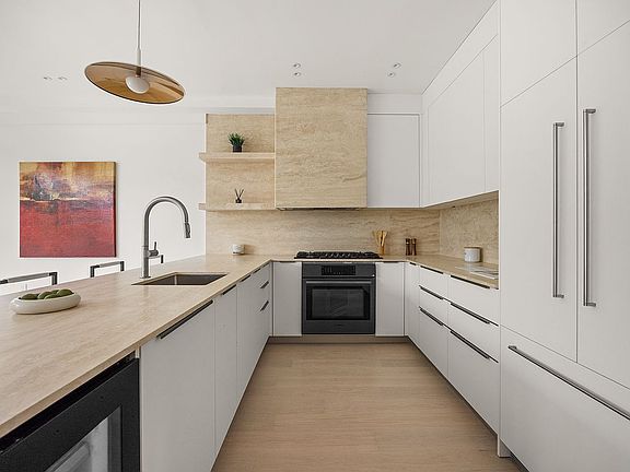 The 25-foot-wide living room is a showstopper - bathed in South Eastern light from dual exposures and seamlessly connected to a second balcony. This space has room for sectionals, play areas, and a large dining room table that can seat 8. The kitchen, wrapped in Travertine stone featurs a Fisher & Paykel refrigerator, Bosch dishwasher, large wine fridge, and a gas range with vented hood. A sprawling countertop offers prep surface and bar seating with storage galore underneath.