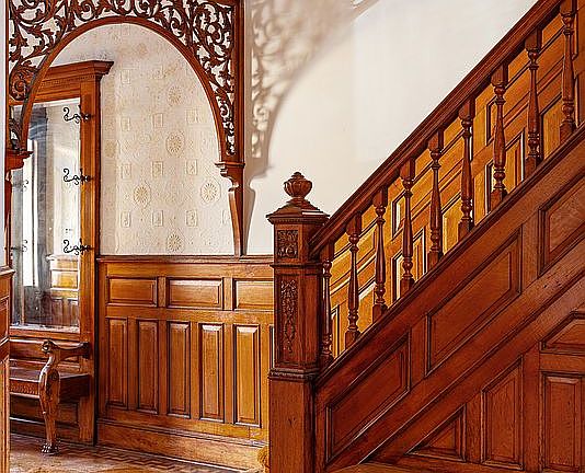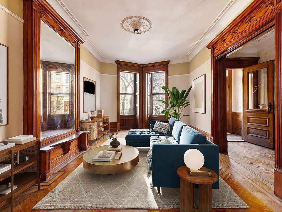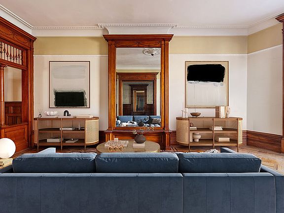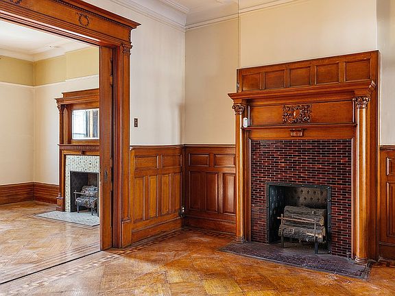 The home’s striking L-shaped stoop leads to an impressive front entrance, highlighted by Romanesque carvings and the original wood-and-glass double doors, which have been beautifully preserved. Inside, the parlor floor welcomes you with elegant pier mirrors, intricate moldings, and original parquet floors. This level features a formal living room at the front, a cozy lounge area with a fireplace in the middle, and a spacious library, also complete with a fireplace.
