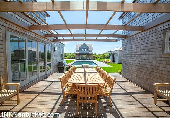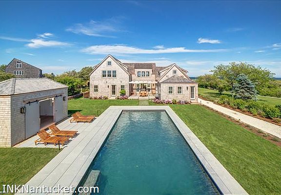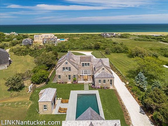 56 Squam is a stunning newly constructed contemporary beach compound with sweeping 1st floor water views over conservation land and Squam Pond to the Atlantic Ocean. Less than 50 yards from the property is grassy path to Squam Beach, one of most secluded and pristine beaches on the island. A portion of the property abuts over 300 acres of unbuildable Nantucket Conservation Foundation land offering a unique and private setting. The chic and stylish estate was thoughtfully conceived and executed by the distinguished Nantucket design team, Cleans Lines Development and Elisa H. Allen Design and Development. The house, cottage, cabana, gunite pool and amazing outdoor living areas are situated on an elevated lot with views of the Atlantic Ocean and Sankaty Lighthouse. The Main house has over 5500 sq. ft. of finished living space on 3 levels with 5 bedrooms, 5 full & 3 half baths, and a 1000 sq. ft. Guest cottage, on 2 levels with full kitchen, living room, powder room, a spacious bedroom and a full bath. Additionally there is a 200 sq. ft. cabana with a reclaimed mahogany ceiling, a 20' x 40' heated gunite pool with auto cover and surrounded by a large scale 2' x 5' bluestone patio. Diligent and creative thought went into designing an outdoor oasis framed by imported Pennsylvania field stonewalls, indigenous plantings and landscaping, several mahogany decks, including a covered front porch with ocean views. The spacious back deck with a contemporary custom designed cedar pergola is ideal for outdoor dining. Only the highest quality materials were used and craftsman employed to create this magnificent property. No expenses were spared with exquisite lighting fixtures from the Nantucket Light Shop, top-of-the-line plumbing fixtures from the Nantucket Water Closet, gorgeous stone and tile from the Nantucket Tile Room and artwork from Nantucket photographer Lauren Marttila. A fully integrated Sonos sound system with speakers inside and out all controlled by phone, tablet or on one of panels throughout the house. Additionally, there is amplified Wi-Fi throughout the house and outside. The house is furnished by Nantucket Looms and a furnishing package is available upon request.