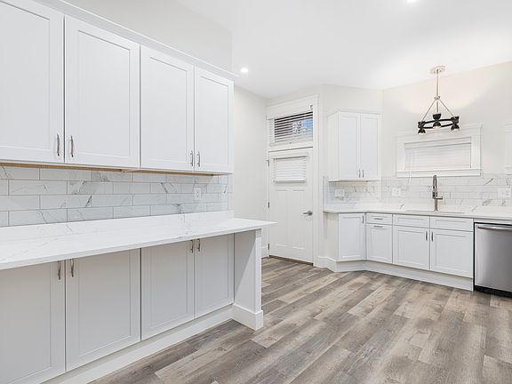 Laundry roomWhite tile backsplashBrand new kitchenCeramic tile flooringNew tile bathQuartz countertopsGorgeous hardwood floors