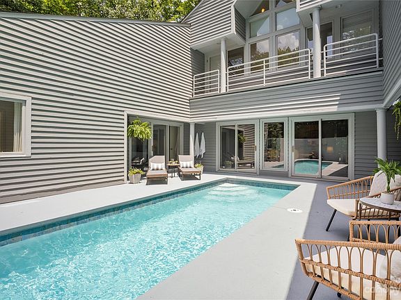 A custom work of art. Built in 1988 by the talented architect Hal Tribble, you are taken back upon entry with the interesting lines and curves of this home. The main event here is the European style pool situated in the center of the home and visible from the living room , dining room, primary and hall, this area will certainly wow your guests for entertaining. Natural light pours in from the many architectural windows throughout the home. It's all in the details, with custom moldings, built in curios, modern doors and sleek finishes. The curved screened in patio is another living area in itself, perfect for all seasons. Home's primary bedrooms features an exquisite design with dual separate dressing areas for the owners. Both secondary bedrooms upstairs have ensuite bathrooms. A dedicated office and full basement with half bath makes this home functional for all needs. Dive on into a piece of art. in this Beautiful home in tranquil, lakefront/golfing resort community of River hills