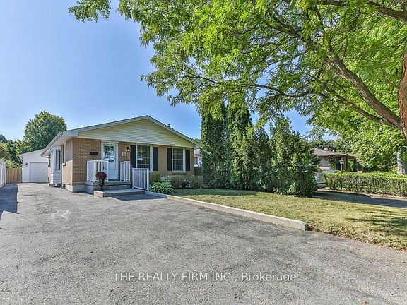 Looking for a bright and spacious home nestled on a quiet, tree-lined crescent with 3 bedrooms, an open-concept main floor, 2 full bathrooms, and a large detached garage? This is the one! With curb appeal in spades, this charming bungalow invites you to step inside and envision your life here with your loved ones. The open-concept main level creates a seamless flow, perfect for both daily living and entertaining. The kitchen features white cabinetry and a built-in pantry, spanning an entire wall, for additional storage. With ample space for dining and an openness to the living room, this layout offers great sight lines for children and increases togetherness while hosting friends and family. Three bedrooms and a full bathroom are located just down the hall, completing the main level. The finished lower level includes a very large recreational room, a second full bathroom, a den with the potential for a kitchenette, a laundry room, and an additional finished pantry/storage room. There is a side entrance that leads directly to the lower level from the driveway. Outside, you'll find a poured concrete patio, accessible through the rear of the home, which can be used for relaxing or hosting. The large lot offers parking for five cars and an oversized, detached single garage with hydro and a dedicated workstation. A separate shed provides even more storage space for lawncare and landscaping tools. This home is close to schools, parks, and all the shopping and amenities you need. Additionally, ease of access to the 401 is another great perk of this homes location.