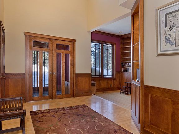 This custom-built Craftsman-style home offers 5 bedrooms, 3.5 bathrooms, Den/Library and a spacious two-car garage with abundant storage, ideally located near Mammoth Lakes grade schools, the community college, neighborhood parks, scenic walking trails, shopping, and dining. Entry begins through a thoughtfully designed genkan, the traditional Japanese foyer that creates a graceful transition from outdoors to in. Beyond, striking 2.5-inch-thick solid birch wood and glass doors open to interiors defined by bamboo flooring, rich Craftsman detailing, and soaring ceilings that create a sense of light and grandeur. Tall wood-framed Pella windows and glass doors bathe the home in natural sunlight while capturing beautiful mountain views. The chef’s kitchen is both elegant and highly functional, featuring a large center island, four ovens, a six-burner gas cooktop, an extra-large professional-style refrigerator and freezer, quartz countertops, custom birch cabinetry with sliding pull-outs in all lower cabinets, and a full-size walk-in pantry. The sun-filled living room is anchored by a gas fireplace and framed by expansive views. A library or office with built-in bookshelves and an ensuite guest bedroom complete the main level. Upstairs are four additional bedrooms, a full-size laundry room, and a south-facing primary suite with private balcony, heated bath floors, steam shower, jetted tub, and custom cabinets in a walk-in closet. Additional features include two brand-new forced-air heating systems, an Electrolux central vacuum system, and a metal roof with ice-melt system, perfectly suited for Mammoth’s alpine climate.