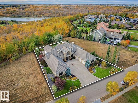 Windermere Ridge Estates, an extraordinary custom Cove Properties home nestled along the edge of the river valley with a 23,875sqftlot. This grand residence blends timeless architecture with resort-style amenities, breathtaking indoor-outdoor living & meticulous landscaping sets the tone for refined river valley living. Inside, the home is a showcase of artisan craftsmanship & luxury finishes -11,649sqft of total finished living space – 4 beds plus 2 beds, 6 baths, Gourmet Chef’s Kitchen, Elegant Dining Room, Primary Suite with 2 ensuites – Dressing room & private office, Gym with Spa area, Yoga Studio, wine room, Theatre Room – 2 Triple Attached Garages & so much more. Stepping inside the elegance & quality is felt from the heated limestone floors to the living area boasting craftsmanship like no other with exposed beams, ambient lighting & a commanding metal fireplace. Whether hosting lavish dinner parties or savoring quiet mornings, this property is more than a home, it's a family estate.