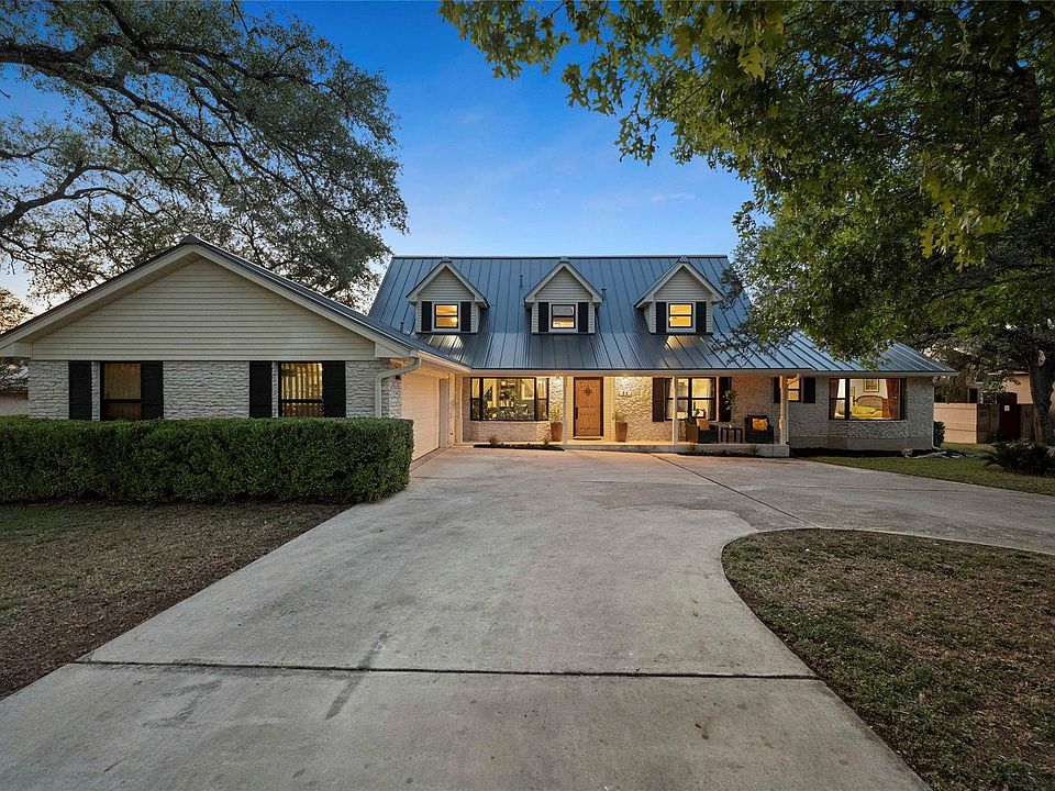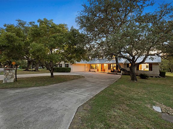 Few homes begin as a cornerstone, as 56 Woodcreek Drive on Hole One of this golf-course community. The first home in the most desirable neighborhood, sets a standard in the prettiest town in Texas. Built by Retired Army Officer Baron for his wife, the design reflects her favorite details from their worldly postings. This modern ranch’s richest attribute: aligned with the spring and fall equinox sunsets, the majestic distant view captures year-round sweeping sunsets across the Hill Country valley and over the Double J Ranch Golf Club. Second owners lovingly updated it with modern appeal, preserving the classic Texas limestone, granite, and custom Rosewood cabinetry. From arrival, the home makes a statement. A wraparound driveway leads to the sleek lines of a heavy-gauge metal roof. Enter through a solid walnut door onto hickory floors and abundant light from new double-pane windows. The grand living room showcases a limestone fireplace and oak mantelpiece. The traditional floor plan offers privacy, comfort, and energy efficiency. The spacious eat-in kitchen features a bay window seat overlooking the horizon. Outfitted with new Bosch stainless steel appliances, it’s perfect for weekday cooking and effortless entertaining. A bonus room with built-ins serves as dining room, study, or creative retreat. In Woodcreek, outdoor living shines. Walk or ride to Cypress Falls, dine al fresco, grill beneath the stars of this dark skies' community, or watch hummingbirds from a hammock. The master ensuite is a spa retreat with travertine and ceramic tile, a James Mont chinoiserie credenza fitted, a Jacuzzi for two, and heated bidet. Upstairs, two bedrooms share an Italian-inspired bath and access to a bonus deck with distant valley views. Every update from solid wood doors and fixtures to smart LED lighting was curated by a local designer. 56 Woodcreek is more than a house: it is a work of art, crafted for a tranquil Hill Country lifestyle.
