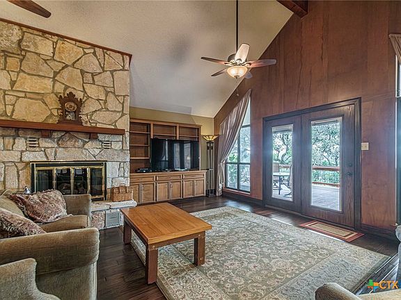 Gruene River is a picturesque subdivision in New Braunfels, TX, nestled along the banks of the Guadalupe River in Comal County. The neighborhood features a variety of home styles—from cozy cottages to spacious family residences and modern retreats. This outstanding property offers 2.82 acres surrounded by lush greenery, mature trees and a tranquil setting ideal for nature lovers. The main home is approx. 2875 sq.ft. 3 bedrooms, 2 bath, 2 rock wood burning fireplaces, 1 wood burning stove, vaulted ceilings and built-in bookshelves. From the livingroom and primary bedroom the french doors lead to the covered deck/partial open deck where you can enjoy the hot-tub or just sit and enjoy mother nature's best. The upstairs loft is spacious and has multiple uses including game room, office, workout or bedroom with a walkout open deck. There is plenty parking for an RV or utility vehicle, plus a 2-car carport. The detached 3 car garage features a 432 sqft workshop, with AC, water & electric, with a cozy 1 BR, 1Bath, 651 sq.ft. apartment upstairs. Easy access to FM 306, historic Gruene, local shopping, medical and schools. Come take the tour, you won't be disappointed!!