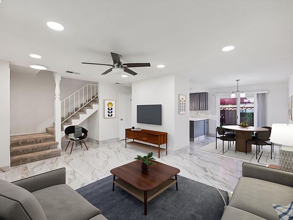 Beautiful NORTHEAST facing townhome tucked at the end of a quiet court in the desirable Twin Creeks neighborhood! Recently updated with beautiful elegant oversized tile flooring & baseboards in the living room/dining room/kitchen. Large spacious light filled living room has new recessed lighting and ceiling fan. Updated modern kitchen with quartz countertops, full tile backsplash, gray cabinetry, and stainless steel appliances, including refrigerator. Dining Room with plenty of space for entertaining opens to the private back patio with beautifully tiled patio, shade and storage. Guest bathroom is located off kitchen and laundry closet in kitchen with washer and dryer included has additional overhead storage cabinets. Spacious primary bedroom upstairs w/mirrored closet doors, new ceiling fan and large window overlooking backyard. Two additional bedrooms with mirrored closet doors and recently added overhead lights. Updated full bathroom with newer vanity, sink, light fixture & mirror. This move-in ready home also features Nest Smart Thermostat, Dual Pane Windows, 1 Assigned Carport Parking Space, Ample Guest Parking and Community HOA Pool. Located close to top-rated San Ramon Schools, parks, shopping, dining, City Center Bishop Ranch & Easy Freeway Access.