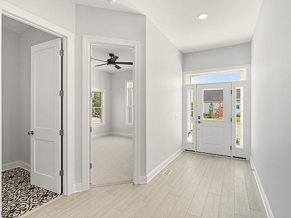 The gourmet kitchen features custom cabinetry in white, quartz counters, and high-end Bosch appliances, and a pantry. This area opens to a spacious dining area and great room with a cozy fireplace with a separate coffee station, or bar. The luxurious owner's suite offers a vaulted ceiling with a ceiling fan, and it also includes a soaking tub, double vanities, walk-in shower, and expansive closet. Additional highlights are a 1st floor den with a closet. The laundry room includes the washer and dryer, and a laundry sink with storage.