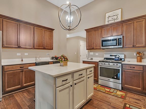 Introducing the highly sought-after Ranch Duplex, ready for immediate occupancy-no need to wait for new construction! This stunning home features a fully finished basement complete with a 3rd bedroom, bathroom, rec room, and ample storage. Built by MORA Builders, it showcases exceptional craftsmanship throughout. Enjoy the elegance of hardwood floors, quartz countertops in the kitchen and baths, and stainless steel appliances. The spacious kitchen boasts custom cabinetry, 42" upper cabinets, a large island, and a cozy fireplace. The home is finished with wide trim, two-panel doors, and stylish lever hardware. The master suite offers a walk-in closet and a luxurious spa-like shower. With a two-car garage, high-efficiency furnace and A/C, and main-level laundry with commercial-grade washer and dryer, this home is as practical as it is beautiful. The open-concept design with cathedral ceilings seamlessly connects the living, dining, and kitchen areas, offering a bright, airy space perfect for modern living. Designer finishes and well-appointed amenities are featured throughout, including gorgeous tile work, paddle fans, recessed lighting, and more. The fully landscaped yard, complete with a paver patio, is perfect for relaxation and entertaining. The home's curb appeal is further enhanced by architectural shingles, a charming front entry arbor, and an inviting designer front door. Situated in a prime location, this home is just 1 mile from the Metra train and offers easy access to shopping, dining, and transportation. Enjoy the ease of maintenance-free ranch living in a home that truly has it all!