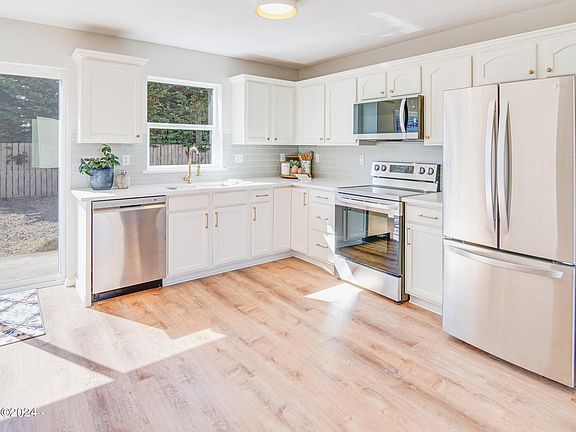 Remodeled 4-bedroom home with bonus room features extensive upgrades! The kitchen has been completely refreshed with quartz countertops and new appliances. Ideal for short-term rentals, it boasts a low-maintenance backyard and ample guest space. Located downtown, it's perfect for shopping and just 3 blocks from Alsea Bay! Additional highlights include a tankless water heater, fresh paint inside and out, and all-new flooring. The versatile third floor can serve as a primary suite, kids' area, or office. No flood insurance required!