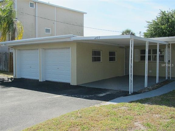BRING YOUR BOAT AND YOUR CARS to enjoy waterfront living on the quietest street in Island Estates. Located on a deep water canal within minutes of John's Pass, the intra coastal and the Gulf. This single story home has an open floor plan with an abundance of windows just waiting for your personal touch. The Kitchen, Dining Room and Den overlook the intra coastal canal and a large backyard and patio with 36 ft of waterfront. A 12ft dock for jet skis and can moor a 30ft boat. The spacious Living Room has a wood burning fireplace and waterfront views. The Master Bedroom has built in shelves and waterfront views and all bedrooms have cedar closets. The unattached apartment is a 1Bedroom/1Bath perfect for family, studio, office etc. Waterfront view, tile floors. large closet and separate patio. A great breeze way to separate the 2 living spaces. If you collect cars there is 2 car garage, 1 car carport and room to park 6 additional vehicles.