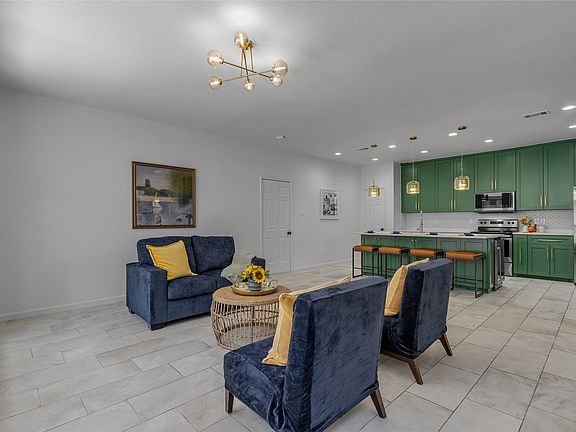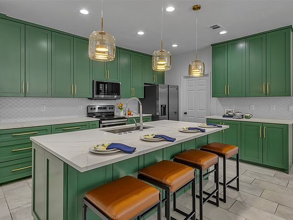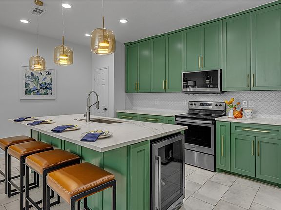 The open layout makes daily life seamless, with all living areas downstairs and bedrooms tucked upstairs for privacy. At the heart of the home, the chef’s kitchen shines with rich green custom cabinetry, glamorous gold hardware, soaring 54-inch uppers, and plenty of room for cooking, hosting, and gathering.