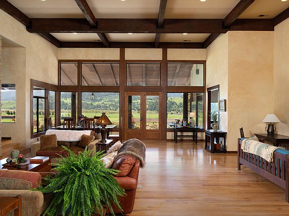 Centrally located near Solvang and the Santa Ynez Mountains on two parcels 35 & 30 acres+/-. Total acreage of 65+-. Two water meters 4 inch ag and estate. 5400+/-sf main residence with panoramic views of the Alisal Ranch. The home has 5 bedrooms with en-suite baths and 2 half baths. The setting is spectacular. To the southwest of the home is the 12 stall center aisle barn with a laundry, bath, wash racks, vet area, tack room, kitchen with dining and patio. In addition is an 8 stall covered mare motel with turn outs, competition arena, hay & storage barn, pastures with cover from the elements, areas for eventing & dressage including trails and water feature. Among the barns and workshops is a large triplex which includes a studio, one bedroom and two bedroom unit. Relax and enjoy the Santa Ynez Valley's beauty and privacy all from your own ranch estate