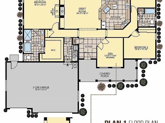 This single-level, 3 bedroom + den, 2 bath Shadow Ridge home is gently nestled in the up and coming Spanish Springs area.. Each Plan 1 offers 2,352 square feet complete with a 3-car garage, vaulted ceilings, fireplaces and walk-in closets. In addition to the spacious bedrooms, great room, family room and optional dining room, homeowners will enjoy an office and guest room.