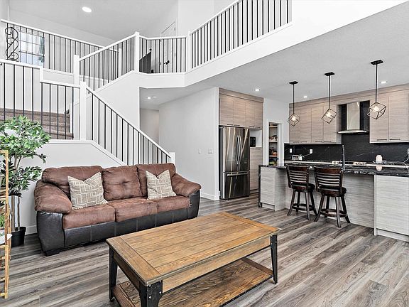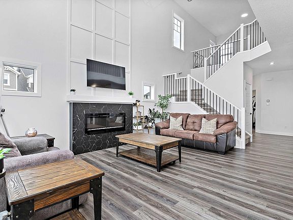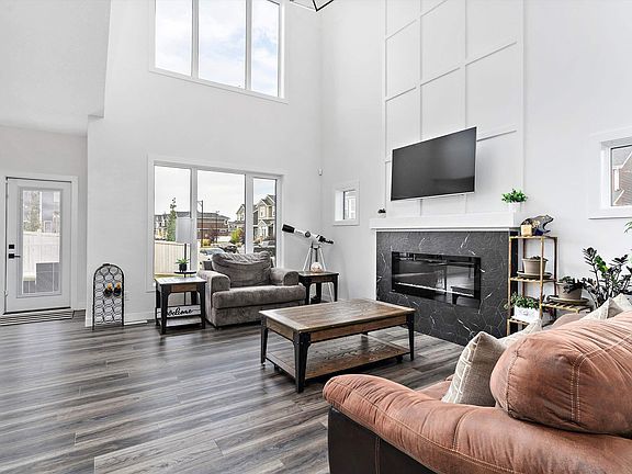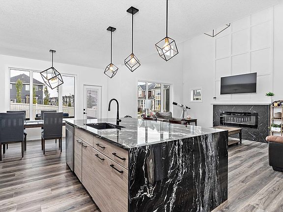 Welcome Home to Southfork! Built in 2022, this 2,246 sq ft two-storey showcases modern design, quality craftsmanship, and upgrades throughout. Step inside to an open-concept living area with a feature wall, tiled surround electric fireplace with mantel, soaring 20’ ceilings, and expansive west-facing windows that flood the home with natural light. The kitchen has premium cabinetry, a large waterfall granite island, stainless steel appliances, and a walk-through pantry. Also on the main floor, den, stylish half bath, and mudroom with built-in bench and shelving. Upstairs, retreat to the luxurious primary suite with tray ceiling, a spa-like 5-piece ensuite with dual sinks, soaker tub, floor-to-ceiling tiled shower, plus a spacious walk-in closet. The upper floor also features a bright bonus room, two additional bedrooms, a 4-piece bathroom, and a dedicated laundry room with sink. Additional highlights include:Side entrance with suite potential in the basement, oversized deep garage, rear deck, central A/C.