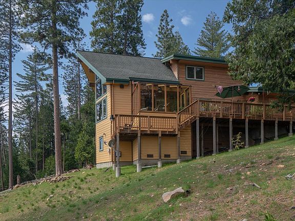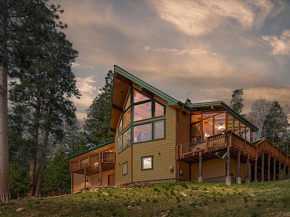 Mountain High'' is a premium property located in Arnold, California on a beautiful 14.9-acre wooded parcel with a magnificent, "jaw-dropping" panoramic view. One can see the tops of the Giant Sequoia of nearby Calaveras Big Trees State Park and distant peaks of Yosemite. This Lindal Cedar chalet is strategically oriented to maximize passive solar heating in winter and to best capture the breathtaking views. Attention to detail & quality in every inch give the feeling of comfort & confidence throughout. With its fireproof siding and highly fire-resistant roofing, the home is not only beautiful but also well-protected against potential hazards. The primary bedroom views the same panorama out the French doors and stays extra cozy with its own gas log stove. Fun is found in the lower level rec. room with an Italian slate pool table. Granite kitchen has a pass thru to the deck and the sun room is perfect for morning coffee and breakfast. One can enjoy being mesmerized while sitting in the great room watching the snow falling, especially at night with custom up & down lighting outside creating the feeling of being in a snow globe. The thoughtful features include full house sound & security systems, commercial grade carpet in the rec. room, backup generator, firewood lift, solid hickory flooring, red oak cabinetry, central heat & AC and central vacuum. Included for utility are the Yamaha quad with snow plow and trailers. There are two complete lists of features & amenities and included items available to thoroughly understand and appreciate what this exceptional property offers. Enjoy the year round recreation opportunities that are endless. Bear Valley Ski Resort is just up Highway 4 as are mountain lakes & the Stanislaus River. A 90-minute drive puts you in the most beautiful national park in the world, Yosemite! Overall, "Mountain High" represents the epitome of mountain living, offering a perfect blend of natural beauty, modern comforts, and peace of mind for its fortunate inhabitants.