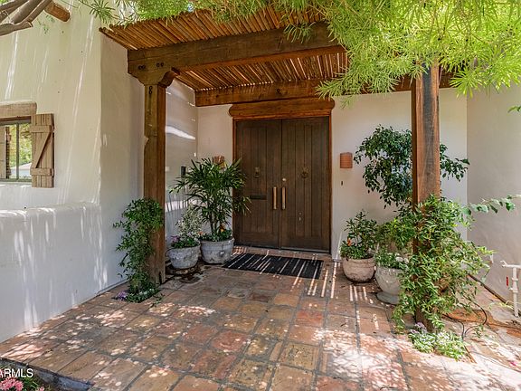 North Central Phoenix Estate in Prestigious Rancho Solano, Territorial Style home with Living room featuring high soaring wood beamed ceilings, Dining Room, Kitchen with breakfast nook, Private Office, 3 Bedrooms with its own Bath, detached air-conditioned casita or private office offering flexibility for today's lifestyle. Garage with 3 doors (3 doors, one as an open space). Private courtyards for primary and secondary bedroom offer a private living space, great large lot footprint, The lush backyard with mature trees includes a sparkling pool, perfect for entertaining. Just minutes from the iconic Murphy's Bridle Path, stroll or bike to the Uptown Farmers.