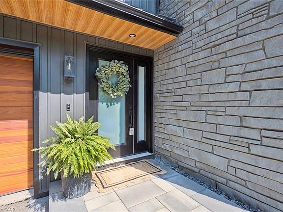 Private Oasis in Waterloo. This one-of-a-kind, fully renovated home offers a cottage-like retreat just minutes from city amenities. Set on 3.7 acres surrounded by trees, a pond, and nature, it combines luxury finishes with smart home technology to create a truly signature property. Inside, the open-concept living room features soaring vaulted ceilings, a propane fireplace, and expansive windows that flood the space with natural light. The chef’s kitchen boasts quartz counters, a spacious island, high-end appliances, pot filler, custom backsplash, and an adjoining pantry with built-in microwave, additional oven, fridge, wine rack, and storage. Perfect for entertaining, the main floor also includes a stylish dining area, built-in bar, walkout to a deck with power awning, and a 4-pc bath. Upstairs, the primary suite is a private sanctuary with breathtaking views, a large walk-in closet, and a spa-like 5-pc ensuite featuring a soaker tub, glass shower, and double sinks. Two additional bedrooms, a 3-pc bath, and convenient upper-level laundry complete this floor. The finished lower level includes heated tile floors, a rec room with cozy wood fireplace and walkout, rough-in for a wet bar, an additional bedroom, office with separate entrance, and a 3-pc bath.The mechanical features include updated electrical & plumbing, Lennox heat pump with backup propane furnace, R/O system and new carbon filter for drilled well, new septic system, solar panels on flat roof generate electricity. Smart home features throughout. Outside, enjoy a private front yard, secondary driveway which allows extra parking, a large patio overlooking the pond with sandy beach and floating dock, plus two charming bunkies—one with a wood stove. All of this within minutes to shopping, schools, markets, and trails. A+++