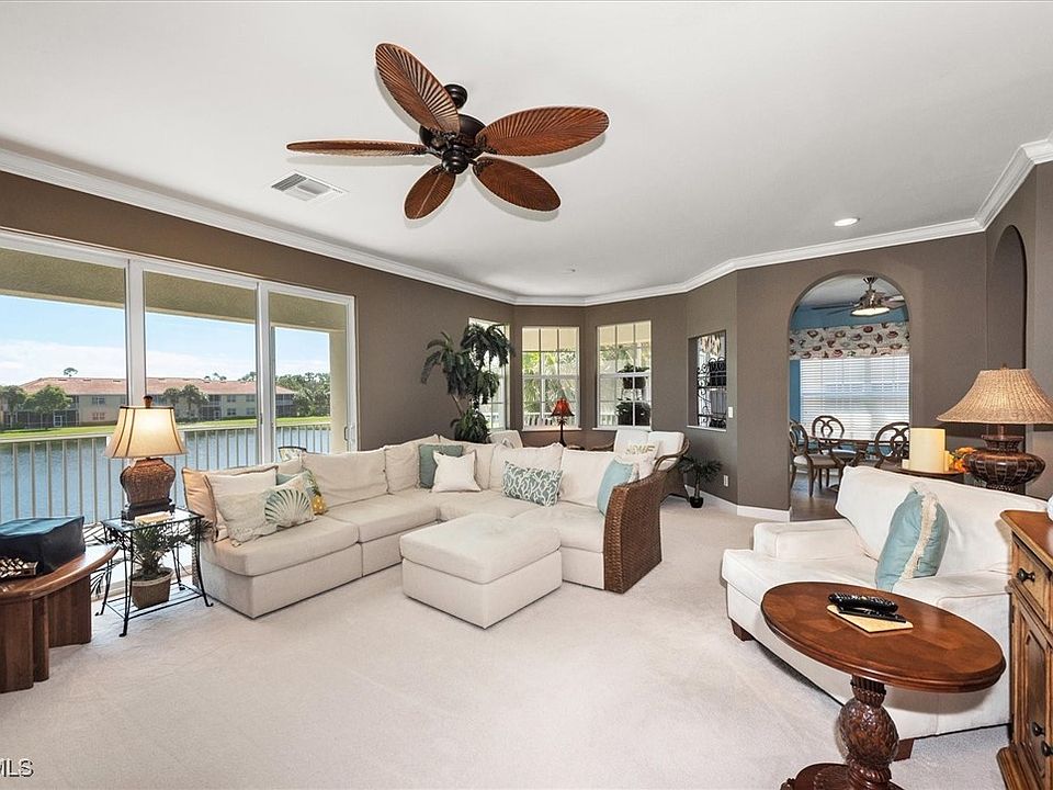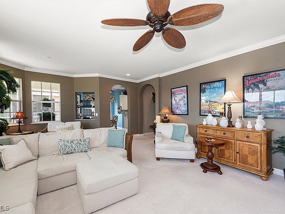 Welcome to Bell Tower Park! This beautifully maintained 4 bedroom, 2.5 bathroom carriage home with attached 2-car garage offers spacious living in one of Fort Myers’ most sought-after gated communities. This second-floor end unit features an open floor plan, high ceilings, and abundant natural light. The kitchen provides a beachy Florida vibe, providing ample cabinetry, granite countertops, and a breakfast nook, while the living and dining areas flow seamlessly for entertaining or relaxing. The primary suite boasts dual large walk-in closets and en-suite bath with dual sinks, large garden tub, and walk-in shower. Additional bedrooms provide comfort for family or guests, and offer privacy with the split floorplan. Creatively use all this space! Currently, one of the bedrooms is being used as a media/music room and another as an office. Make use of all this space to meet your lifestyle needs. You’ll also find the laundry room upstairs for your convenience, no need to hike loads up and down stairs. The wrap-around screened lanai offers peaceful lake views; a perfect spot to enjoy the morning sun with a cup of coffee. The spacious 2-Car garage has built-in overhead shelving for extra storage. Plenty of space for all of your storage needs!