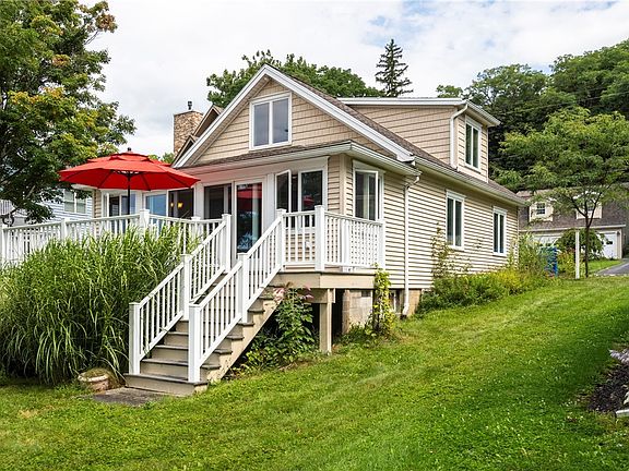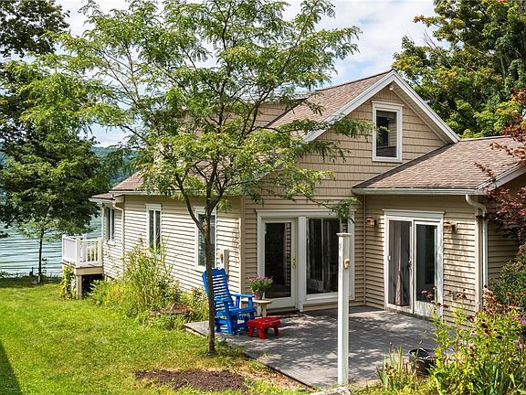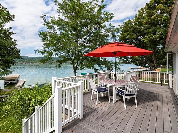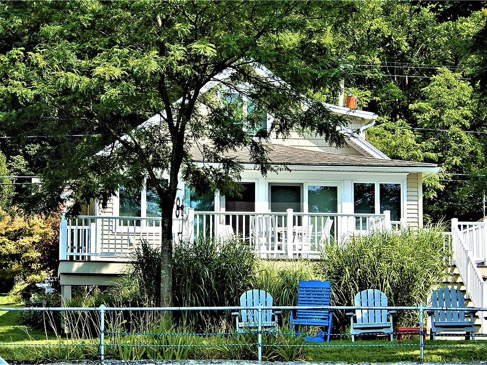 Lake living year-round. Panoramic views. Ready to move in! Don’t miss this updated 3 bdrm home on .40 acre with over 50’ of level lake frontage, private shale beach and dock. Remodeled in 2005 created a spacious open floor plan. Walk in and instantly see the lake through a wall of windows and sliding glass doors. Enjoy sunsets on the large composite deck overlooking the lake. The 1st floor bedroom w/walk in closet has its own entry to the east side deck - great for morning coffee. Upstairs are 2 nice sized bdrms, one overlooks the lake, the other overlooks the garden. Updates include the WoodMode & Corian kitchen, laminate & vinyl floors, roof, vinyl siding, addition of 2nd floor bath, new casement windows with solar shades throughout. In 2008 a 24’x26’ 2-story garage was built with a 2nd floor, ready to finish into a guest house, studio or office with gas, electric, public water and sewer connections ready to finish. Parking is never an issue with the very large paved parking pad. An entertainer’s home with a great location and easy travel to many points of interest in the area. Furniture included. Pontoon boat & hoist negotiable. Offers reviewed Tuesday, June 4 at 2 p.m.