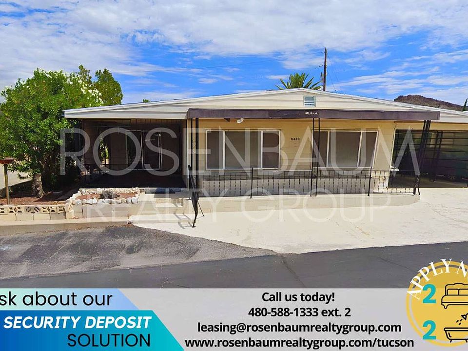 Welcome to this charming and beautifully maintained 2-bedrooms, 2-baths mobile home nestled within a desirable 55+ community in Tucson. From the moment you arrive, you'll be captivated by the inviting front porch with sunshades, a perfect spot to relax with a cup of coffee while enjoying the peaceful surroundings and scenic mountain backdrop. Step inside to discover a bright and spacious open living area filled with natural light, offering a warm and welcoming atmosphere. The layout flows seamlessly, creating the perfect space for both everyday comfort and entertaining guests. The kitchen features elegant black appliances, generous counter space and ample cabinetry-ideal for preparing meals and hosting gatherings with ease. This home also includes a lovely Arizona room, adding versatile living space that can be used as a cozy reading area, hobby room or simply a quiet retreat to enjoy the Arizona sunshine year-round. The laundry room comes complete with a washer and dryer, while the workshop provides additional storage for tools or projects. Outside, you'll find two covered parking spaces for convenience and protection, along with a golf cart included-perfect for exploring the neighborhood or heading to the nearby golf course. The 55+ community offers an incredible array of amenities designed for an active and enjoyable lifestyle. Residents have access to an 18-hole golf course, tennis and pickleball courts, swimming pools, a fitness center, craft rooms and a variety of clubs and social events that foster a true sense of community. Whether you enjoy staying active or prefer relaxing in the sunshine, this neighborhood has something for everyone. Beyond the community, the location offers easy access to shopping, dining and entertainment options, with beautiful desert parks and scenic trails just a short drive away for those who love the outdoors. We welcome all furry friends of any size. Please make sure to submit all paperwork required to be approved within 24 hours & ask about our $0 security deposit Move-in Solution Fee option($85/month non-refundable). All adult over the age of 18 must submit a completed rental application, government issued photo Id, social security card & proof of income (pay stubs for the last 30 days; self employed applicants need to submit their most recent tax returns & at least 6 months worth of bank statements). All documentation must be submitted before the application gets processed. Application fee is $60/adult (non-refundable). Applications are processed on a first come first serve basis. Only complete applications with all documentation, rental verification & funds paid will be considered. Once an application is approved, a holding agreement & earnest money in the amount of at least one month's rent must be submitted by the end of business day to secure & hold the property. The earnest money paid would be applied & credited towards the total required move in funds. There is a 1x admin non-refundable fee of $299 due upon lease signing. All application fees are NON-REFUNDABLE, therefore we suggest that you confirm availability of the property you are applying for before paying & submitting the application during business hours. We Love pets & use a third-party pet screening service, All Applicants Must Fill This Out. If you don't have a pet there is no charge only a couple questions. If you have an Esa or Assistive Animal, no charge, however paperwork will be requested. If you own a pet there is a $30 pet application fee via credit card & a $30 fee for additional pets via credit card. It is $25 if you pay via Ach. Your pet will be given a Paw Score and this will determine your monthly fee along with move in fees. Paw SCORE/FEES: #5- $45/month & $299 at move in. All Rosenbaum Realty Group residents are enrolled in the Resident Benefit Package ($75 Rbp), which includes HVAC air filter delivery (for applicable properties), credit building to help boost your credit score with timely rent payments, $1M Identity Protection, utility concierge service making utility connection a breeze during your move-in, our best-in-class resident rewards program and much more. Security Deposit of 1.5x base rent + a 1x $350 maintenance coordination fee + a 1x admin fee of $299 1x admin due at move-in. Monthly fees are: base rent, 2% monthly admin fee, $75 Rbp, partial utilities(if any). Dishwasher, Electric Stove, Microwave, Refrigerator, Carpet, Laundry Room, Living Room, Air Conditioning, Blinds, Ceiling Fan, Storage, Walk In Closet(s), Patio, Porch, Clubhouse, Community Pool, Gym/Exercise Room, Tennis, Golf & Pet Friendly. Listing provided by RentalSource.