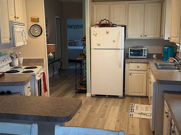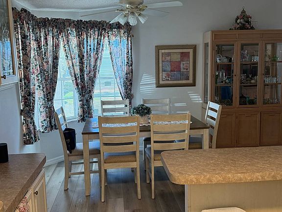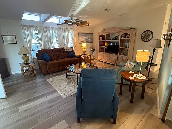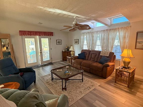 Beautiful Homes of Merit doublewide home. Fully furnished, turn key home. This home has a lovely large front all weather lanai with a vaulted ceiling and ceiling fan. French doors from the lanai open to the large living room. The living room features a vaulted ceiling with transom windows and new LVT flooring. The dining area has bay windows that look out the front of the home. The kitchen and dining area are open and spacious. The master bedroom is very large with a king size bed and ensuite bathroom. The guest bedroom has twin beds and loads of room. The carport is large enough for two cars and there is a back patio the is perfect for your grill. The air conditioner and roof are only 2 years old and the water heater and dishwasher have both been replaced in the last 5 years. The owner recently had all new critter wire installed along the entire foundation of the home. The golf cart is negotiable with the home.