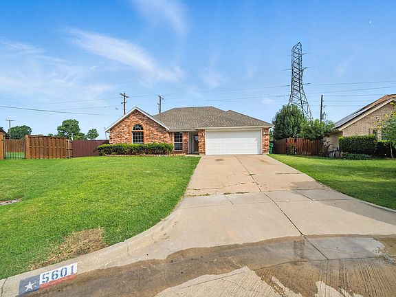 Welcome to 5601 Fairway Circle, a well maintained home centrally located just minutes from Fort Worth and Dallas. This inviting residence features a desirable split floor plan, providing privacy and tranquility. The spacious, bright kitchen boasts elegant light wood cabinetry, ample countertop space, and abundant natural light. Relax in the cozy family room complete with a charming wood-burning fireplace and ceiling fan, perfect for comfortable living year-round. The premier suite offers a serene retreat with a luxurious garden tub and separate vanities. Step outside to enjoy the expansive backyard situated on a generously sized pie-shaped lot, featuring a large covered patio ideal for entertaining or quiet evenings. Additional features include a welcoming glass storm door and thoughtful touches throughout.