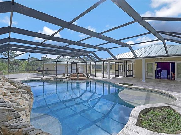 Beautiful custom pool home situated on 20 acres of property offering privacy and tranquility in a great Fort Myers/Buckingham location. Boasting just over 2,700 sq.ft. this 3 bed+den, 2 bath 3 car detached garage pool home offers tons of features! First steps to the front door finds you at an elevated wraparound front porch overlooking the pond. Kitchen features solid wood cabinets, granite counter tops, stainless steel appliances, in wall oven and microwave, double french doors out to side porch, flat top range and tile back splash. Living area has lighted and hand painted tray ceiling with two fans and a wood burning fireplace. Large master suite includes double french doors out to the custom pool area. Double sink vanity with roll in tile shower and Jacuzzi tub. Screened in Pool area steals the show with massive concrete stamped deck, integrated spa, sun shelf and two water features down the stairs and rock waterfall. Detached 3 car garage has a covered walkway from the rear of home with wrap around driveway. Home is completely wheelchair accessible. Property includes a 1900sq.ft. concrete barn with new metal roof and 200 amp electrical service. Make this incredible home yours!